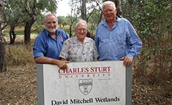Professor David Mitchell (centre in picture), formerly with the CSU Institute for Land, Water and Society (ILWS) and CSIRO, designed a set of treatment ponds and wetlands to treat ‘grey’ water produced in academic and residential buildings on the University’s Thurgoona site.