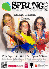 The week-long 2013 SPRUNG Festival of Creativity kicks off at Charles Sturt University (CSU) in Bathurst on Friday 27 September and runs until Saturday 5 October. The 2013 SPRUNG Festival features eight distinct shows at three venues at CSU in Bathurst, in a range of theatrical genres from children’s theatre to physical theatre, comedies and drama. There will also be short film and live TV screenings, and a live-music night on Wednesday 2 October. There is even adult puppetry. Mr Dan Aubin, theatre/media lecturer at the School of Communication and Creative Industries at CSU in Bathurst said, “The Festival showcases the combined talents of 70 theatre/media students across all years, and has helped launch the careers of many graduates. This year’s event is a really exciting mix of theatre, with something for everyone. The various productions are rotated across the week-long schedule, so different shows can be seen at different times.” More information about the performance schedule and ticket purchases can be found online here.Yapun Yapun is a deadly team