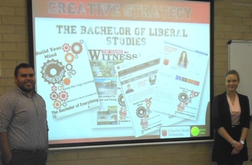 Advertising students at Charles Sturt University (CSU) in Bathurst have delivered marketing communications pitches to representatives of the University today, Thursday 22 May, to promote specific courses. Ms Anne Llewellynn, lecturer in advertising at the CSU School of Communication and Creative Industries in Bathurst, said, "Final-year students from our on-campus agency, Kajulu Communications, were approached by the University because of our consistently high achievements in national student advertising competitions and our successes with real-world national advertiser clients. The Faculty of Arts briefed the students to develop integrated marketing communications strategy recommendations to increase enrolments in the Bachelor of Arts, and Bachelor of Liberal Studies. This was an authentic exercise and learning experience for the students whose aim was to promote two School of Humanities and Social Sciences courses to prospective students. The quality of the presentations was to the highest professional standards." Three Kajulu teams presented in a competitive 'pitch', and the recommendations of two distance education Kajulu advertising teams were handed to the Executive Dean of Arts, Professor Jennifer McKinnon, at the conclusion of the live presentations today. Attending the presentations were Professor McKinnon, Associate Professor Joy Wallace, Associate Professor Chika Anyanwu, Associate Professor Michael Kiernan, Dr John O'Carroll, Mr Brett Van Heekeren, and a representative of the CSU Division of Marketing and Communication. Students delivered their presentations at 9am, 10am and 11am on Thursday 22 May in Foundation Room 1 at the CSU Centre for Professional Development.